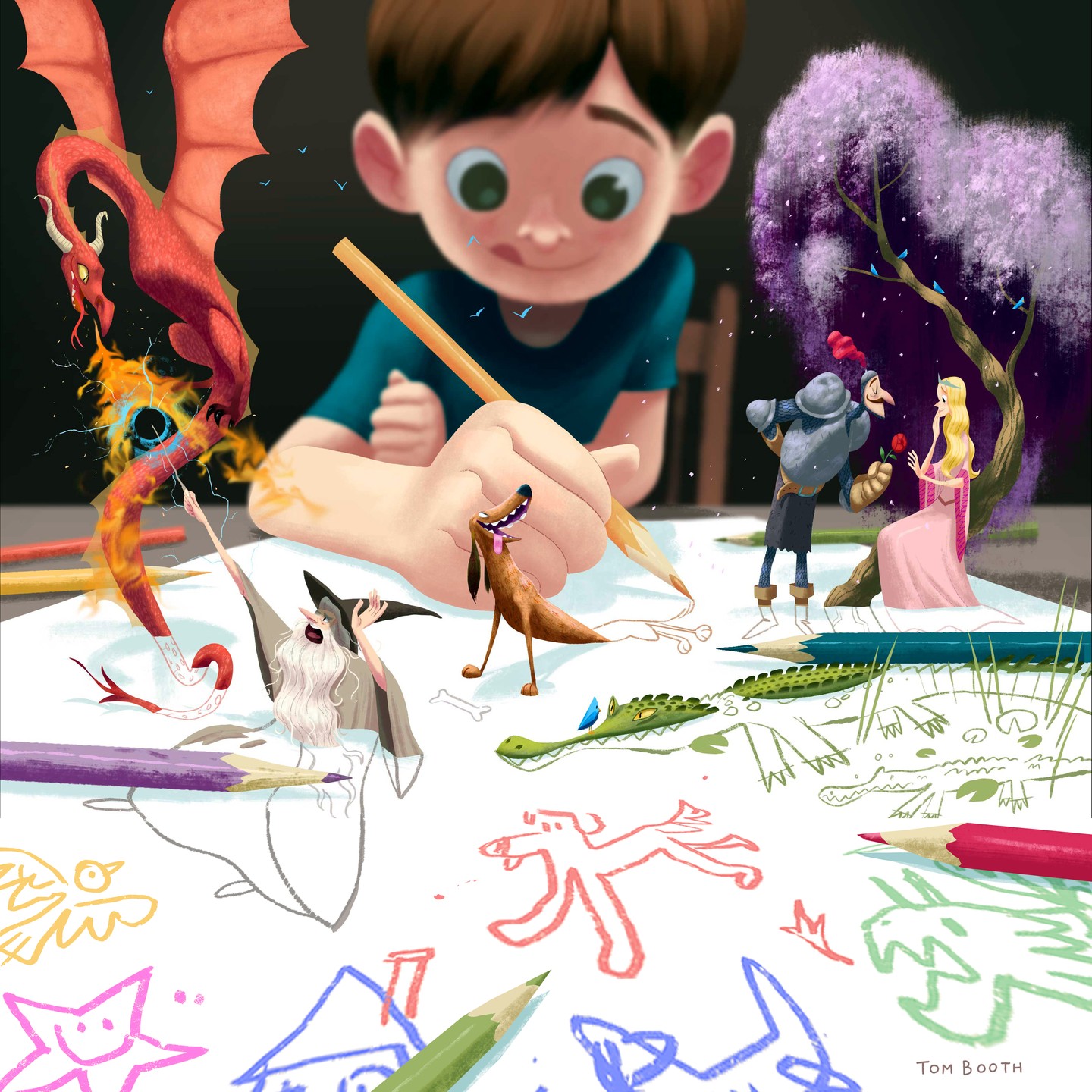 Tom Booth is an author, illustrator, and character designer working in bookmaking and animation. Born on the twelfth day of the twelfth month, Tom made his earliest marks — sometimes on his parents’ antique kitchen table — growing up just outside of Philadelphia. Tom made more marks as a studio art and history major at Hamilton College, then moved to New York City to work at Scholastic to afford a table and art supplies for more mark making. Today, Tom lives in Brooklyn where he writes, illustrates, and designs for publishers and studios—like Simon & Schuster, Netflix, Random House, Macmillan, Walker/Candlewick, and Nickelodeon.