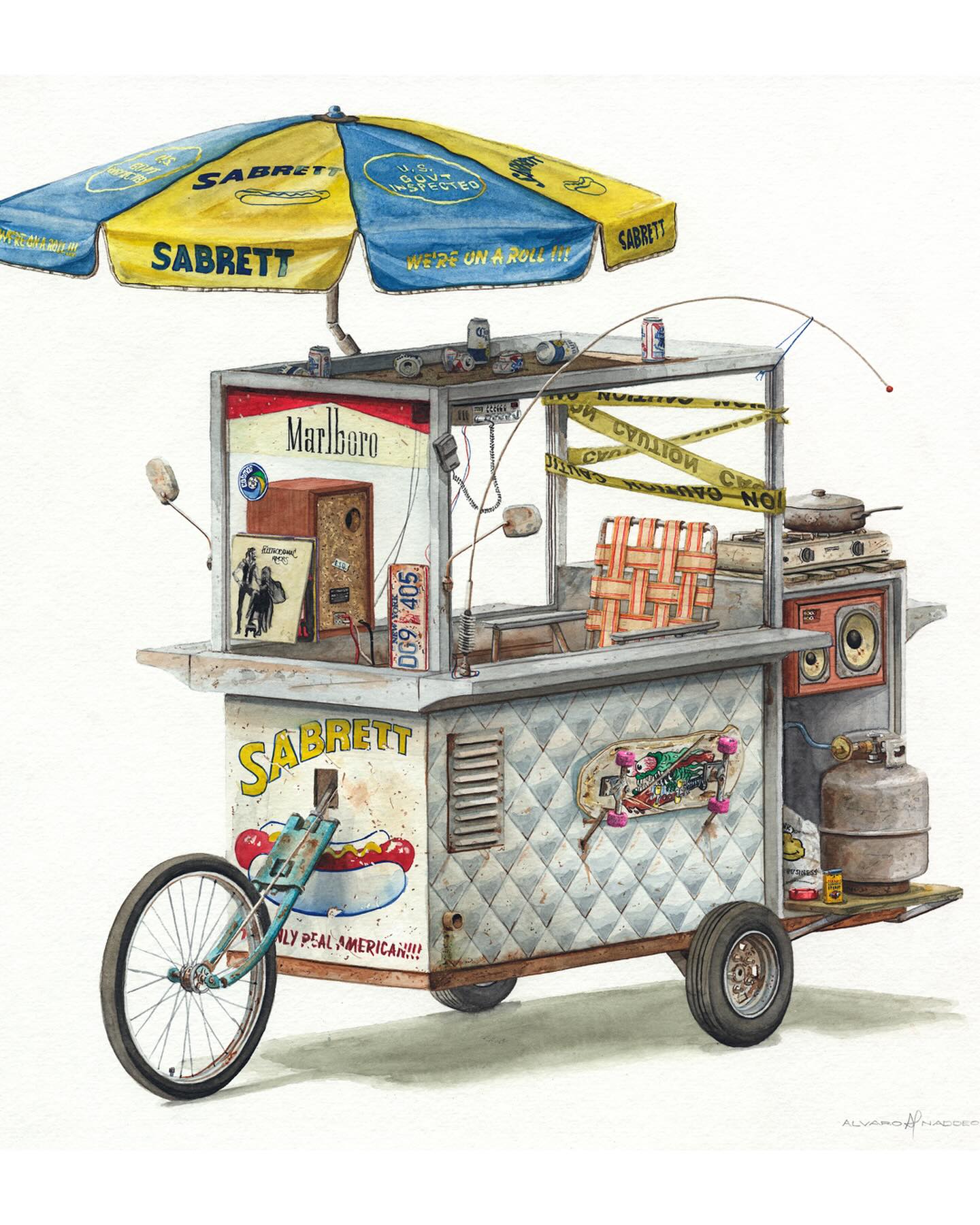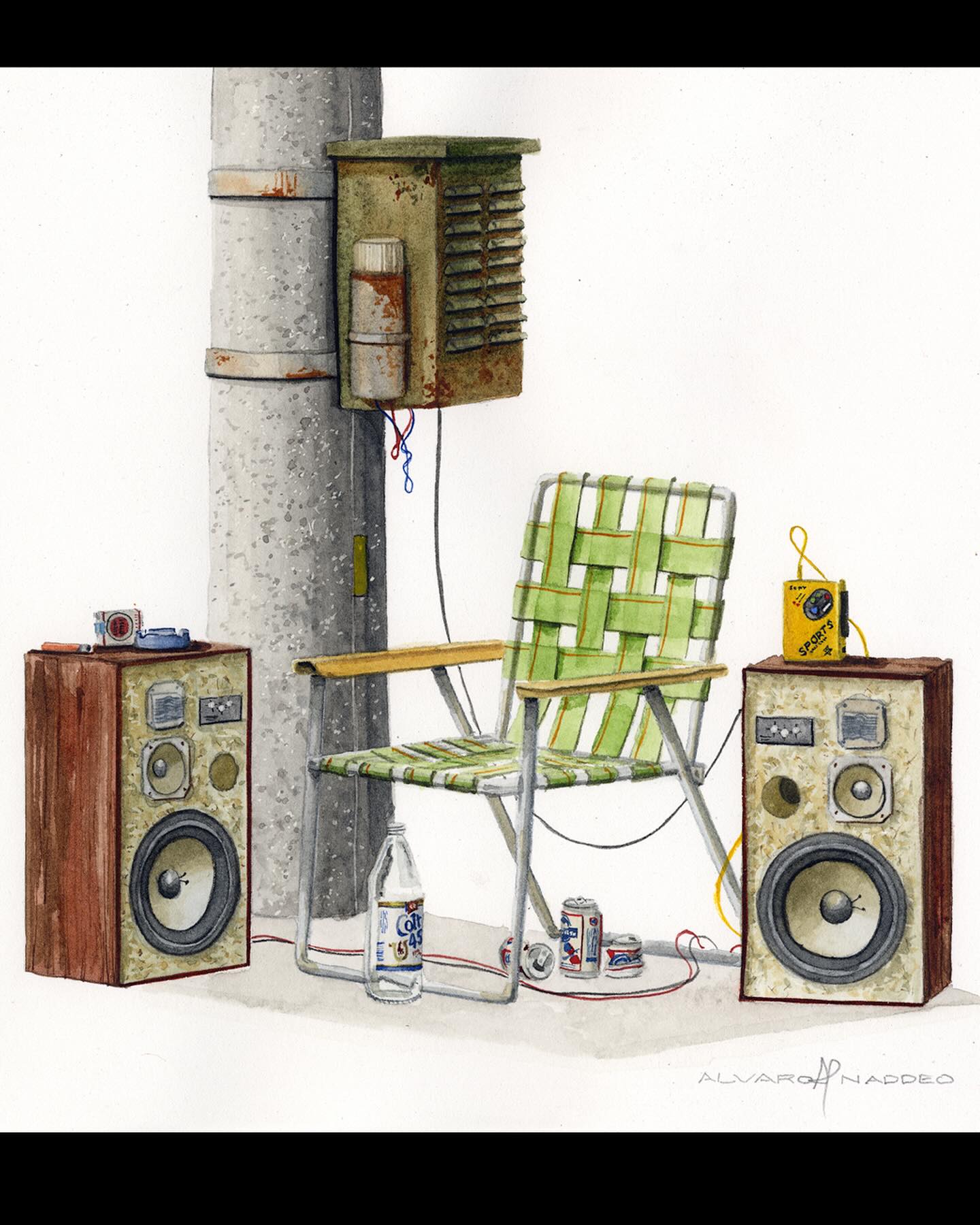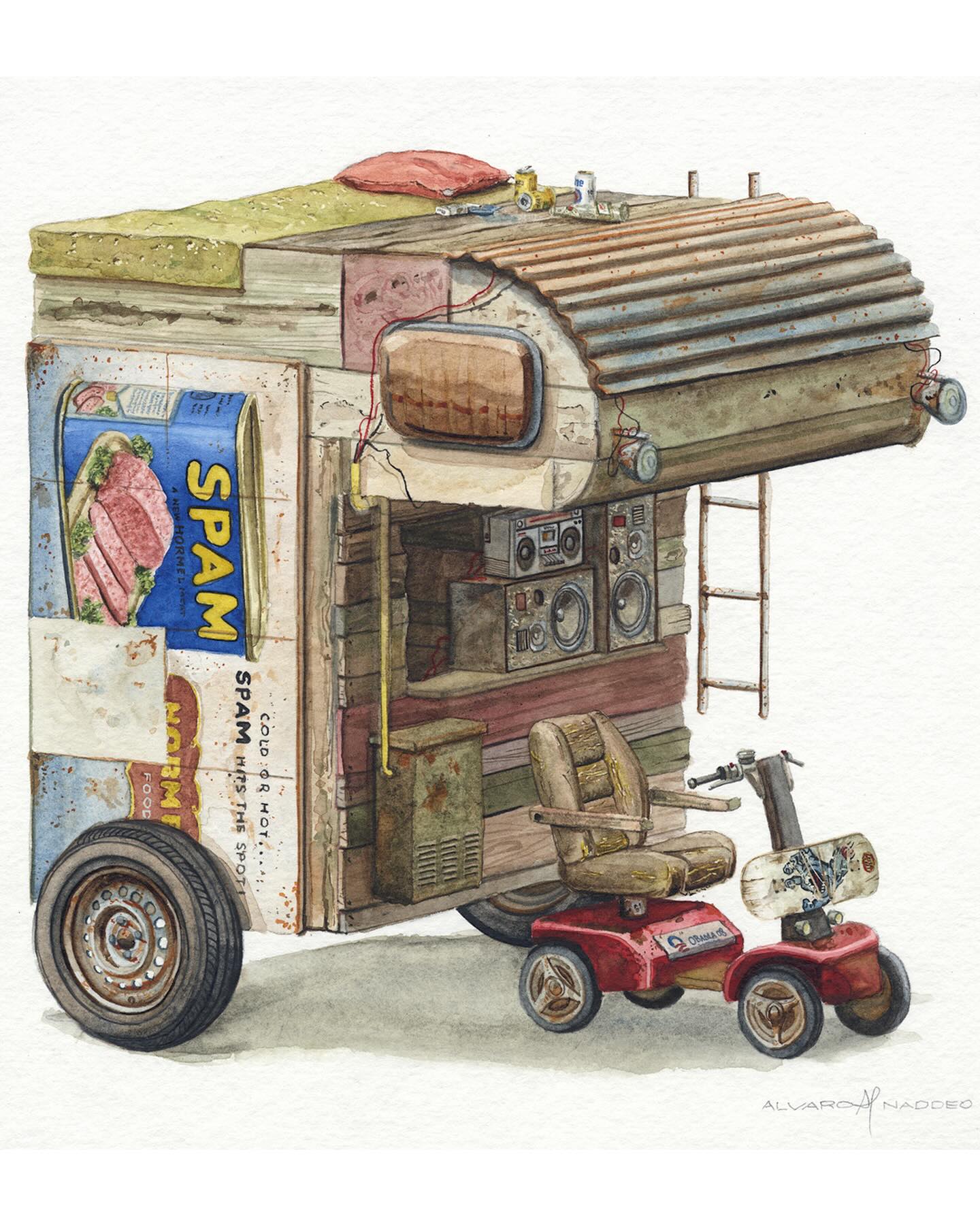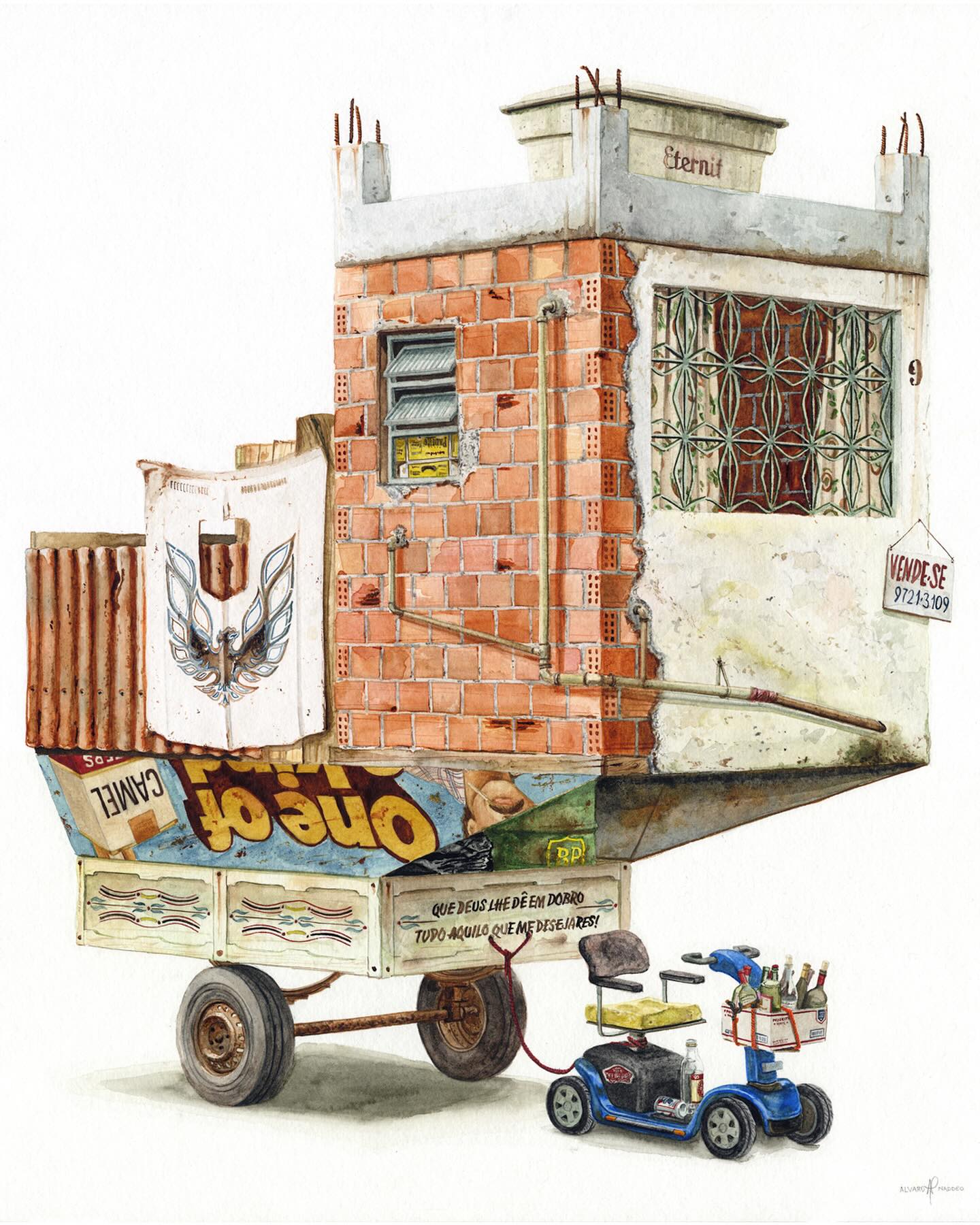 Álvaro Naddeo es un artista brasileño originario de São Paulo que ha vivido en varias ciudades como Lima, Nueva York y actualmente reside en Los Ángeles. Su obra mezcla recuerdos de esos entornos urbanos con reflexiones profundas sobre el consumo excesivo, el desperdicio y la desigualdad social. Después de trabajar más de veinte años en publicidad como director de arte, volvió al arte plástico (particularmente acuarela y medios mixtos) para explorar temas personales y sociales. Naddeo suele utilizar objetos desechados, empaques de marcas y residuos urbanos en sus pinturas como símbolos tanto de deseo cultural como de crítica. Su estilo fusiona señales visuales locales con universales—logos, envases, carteles—acompañados de composición cuidadosa y colorido. Ha participado en exposiciones individuales y colectivas a nivel internacional.