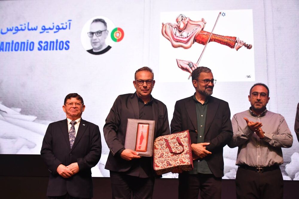Shojaei Tabatabai destacó la colaboración entre la Casa de Arte y Cultura Revolucionarios de Qom, el Ayuntamiento de Teherán, la Universidad de Qom y el equipo artístico para organizar el evento. También mencionó a los participantes de Estados Unidos, quienes presentaron obras “no en busca de premios, sino en apoyo al pueblo palestino”, una señal prometedora. Algunos artistas europeos enfrentaron restricciones que podrían impedirles regresar a su país de origen durante cinco años, pero Vasco Gargalo y António Santos seguían presentes.